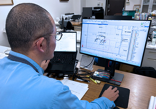 現場での打ち合わせを反映させて、施工図面を作成します。現場では電工さんがこの図面を元に施工作業を行います。